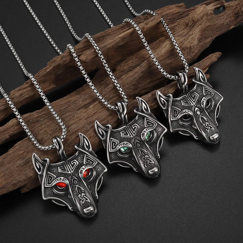 Stainless Steel Viking Wolf Necklace Fenrir | Colorful Rhinestone Eyes