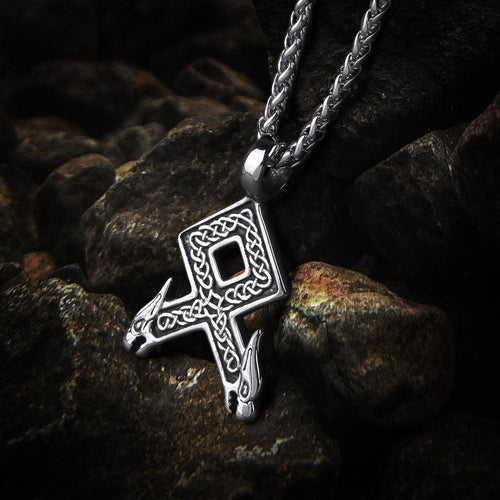 Viking Geri & Freki Wolf Head Thor's Hammer Mjolnir Necklace | Steel Chain